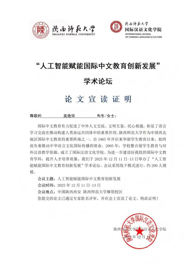 2025年12月12日,由陕西师范大学主办、陕西师范大学国际汉语文化学院承办的“人工智能赋能国际中文教育创新发展”学术论坛在陕西师范大学雁塔校区圆满举办。本次论坛以AI技术与国际中文教育的深度融合为核心议题,汇聚了来自华东师范大学、北京语言大学、科大讯飞等高校及企业的200余名专家学者,通过大会报告、分组研讨等形式,共探国际中文教育数字化转型的实践路径与未来方向。我院教师吴艳华、卢峰受邀参会,在专家学者分组报告中宣读论文,充分展现了该校在国际中文教育与AI技术融合领域的研究实力。